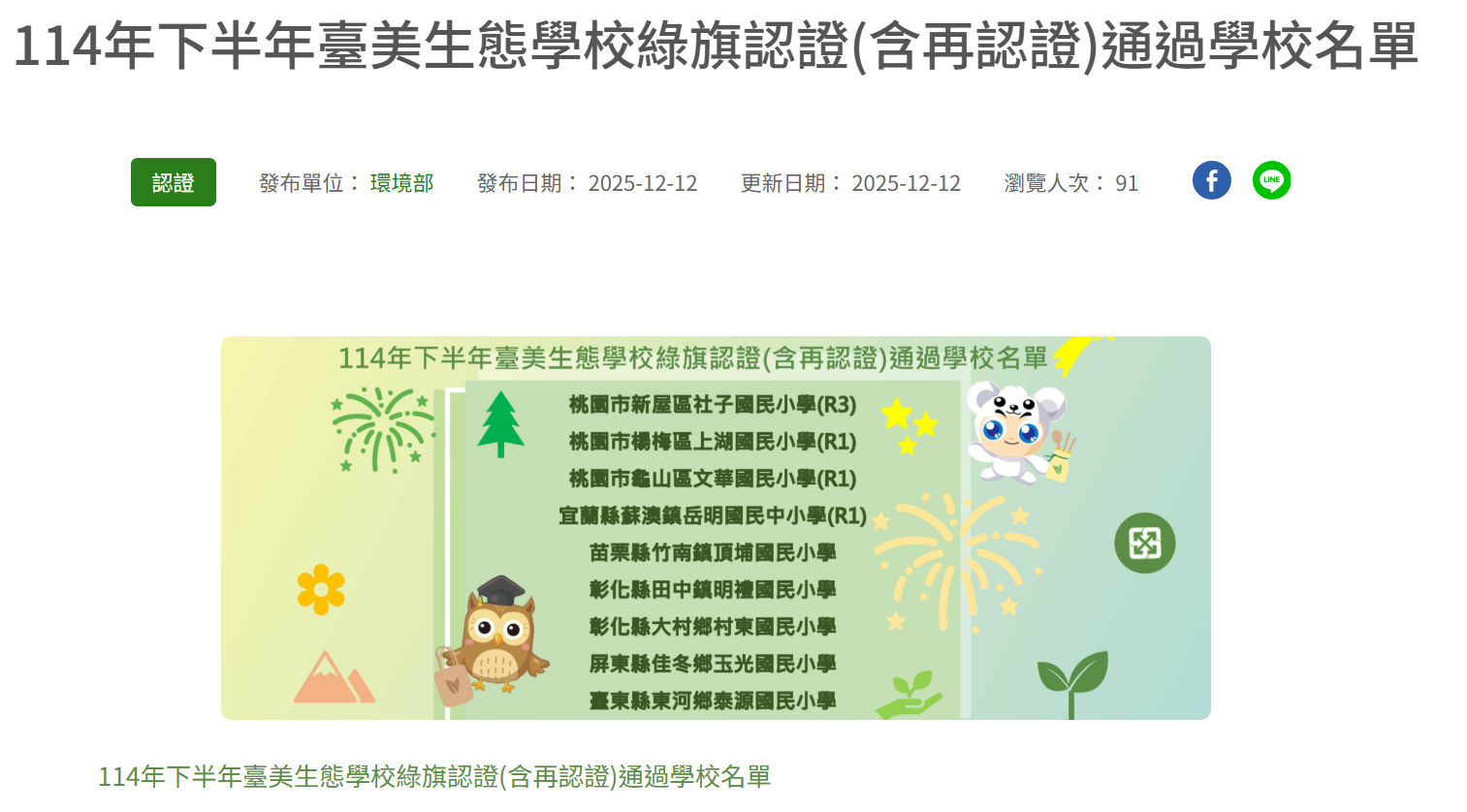 狂賀!本校長期深耕環境教育,繼112年榮獲「銅牌」認證、113年榮獲「銀牌」認證後,於今年(114年)下半年再創高峰,成功通過審查,榮獲臺美生態學校認證之最高榮譽初步的殿堂——「綠旗 (Green Flag)」!