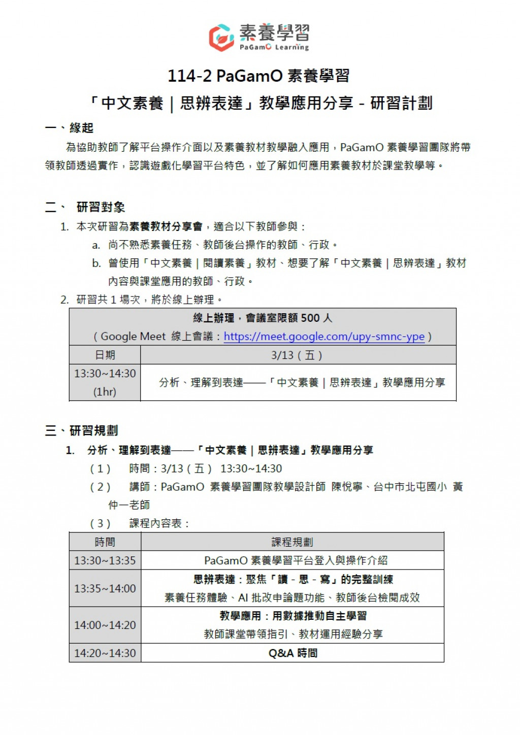 二、因應本學期PaGamO中文素養授權對象調整至3-6年級,且中年級教材內容調整為「中文素養|思辨表達」,廠商爰辦理旨揭研習。